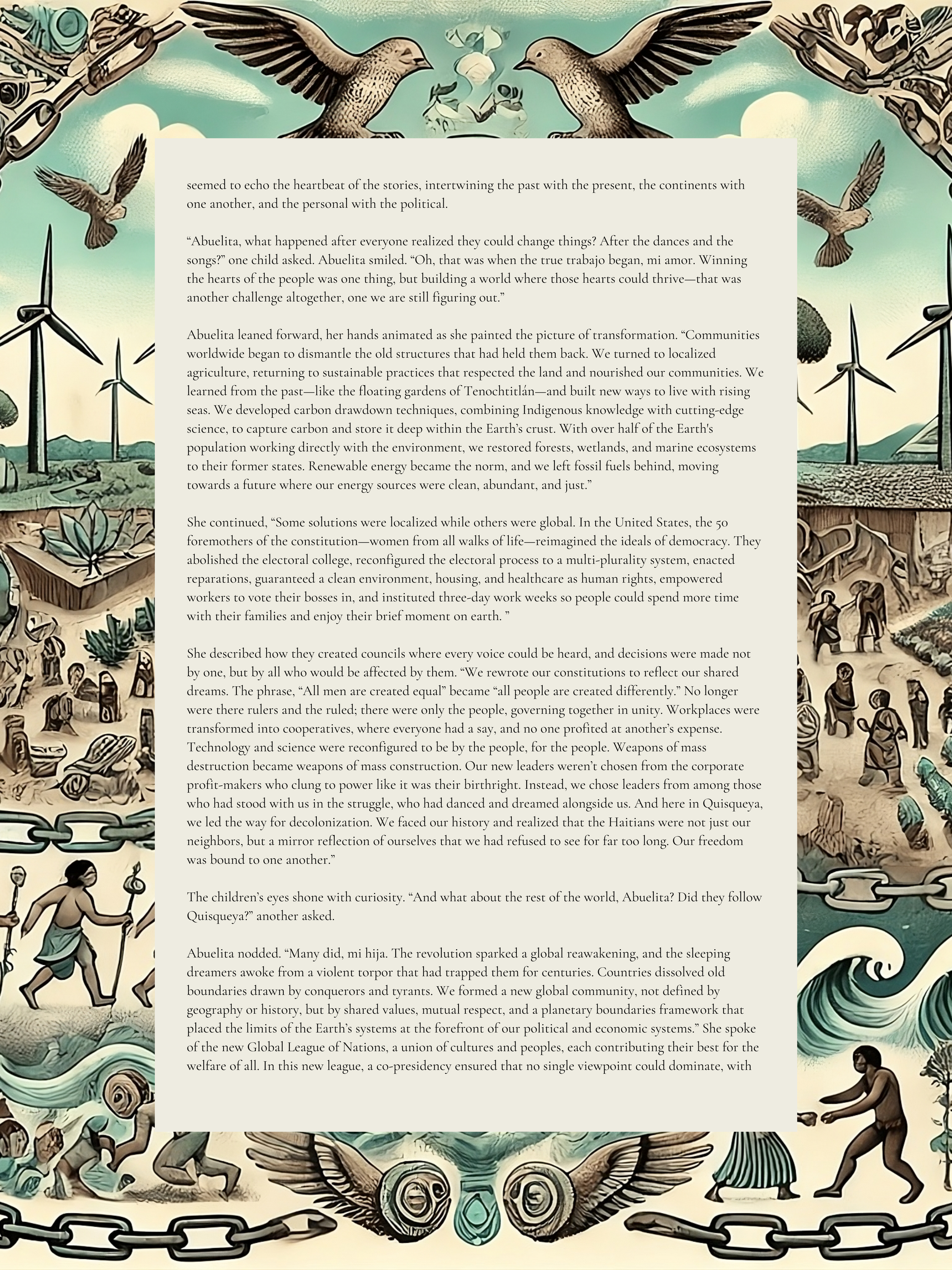 Abuelita recounts how artistic and cultural movements, particularly hip-hop, united communities and how the power of the people overcame divisions imposed by greedy rulers who worshiped only their gods of profit. A series of revolutions, while not without immense struggle and sacrifice, resulted in a transformed society, leading to the democratization of workspaces across the globe, centering sustainable practices that prioritized people and the environment over profit, and inevitably the creation of new political systems. Renewable energy became the norm, localized agriculture allowed the planet to heal, and advancements in carbon drawdown techniques, developed through collaboration between scientists and Indigenous leaders, mitigated the worst impacts of climate change.